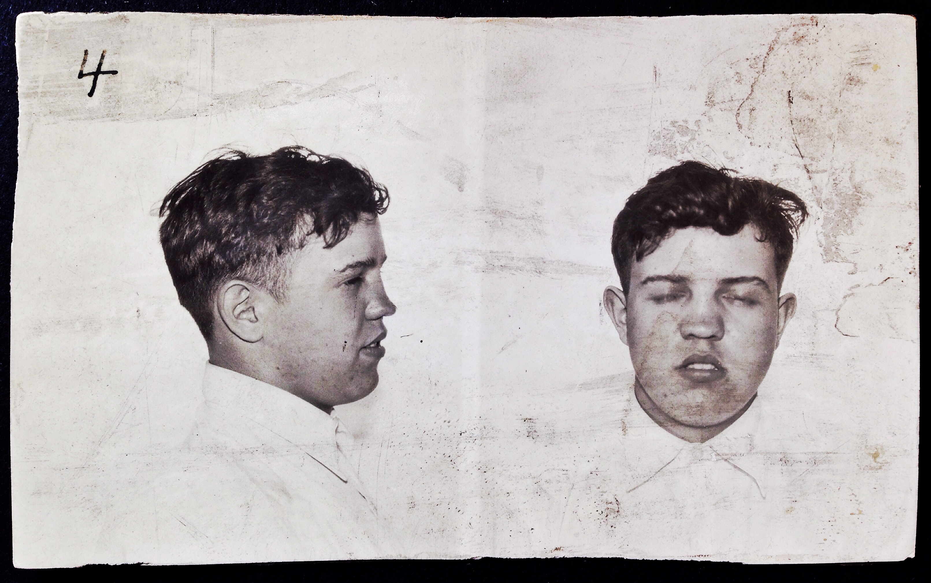 The number written in ink on his photograph shows that he was the fourth person to be processed after the police started numbering their mug shots. They had started a collection of photographs of habitual offenders in 1917. A few years later, the cupboard in which they were kept was so full that it collapsed under their weight. The photographs were kept in stacks on the floor of the office of the chief of police until 1922, when they were moved to a custom-built display cabinet that everyone called the rogues gallery.
